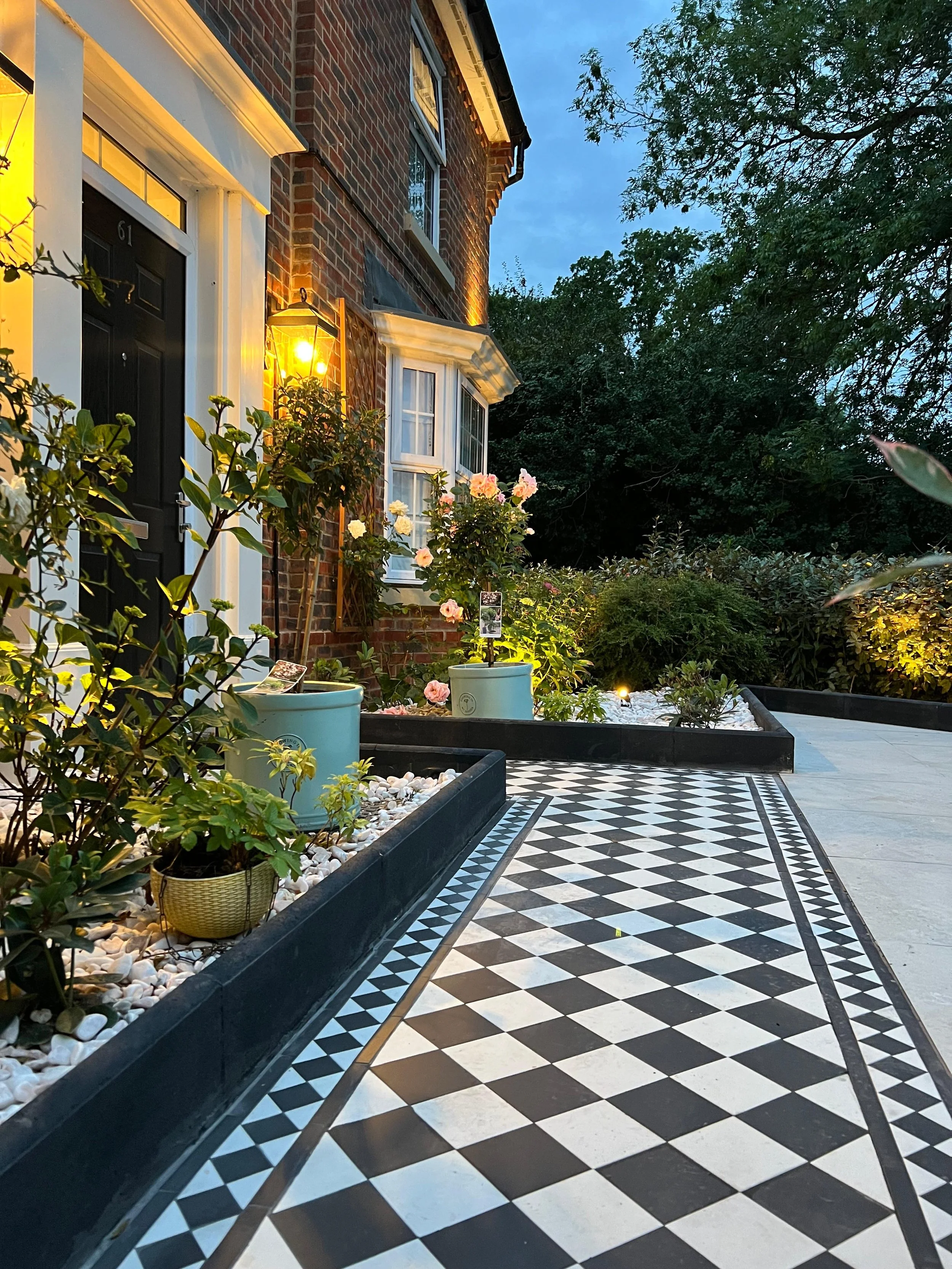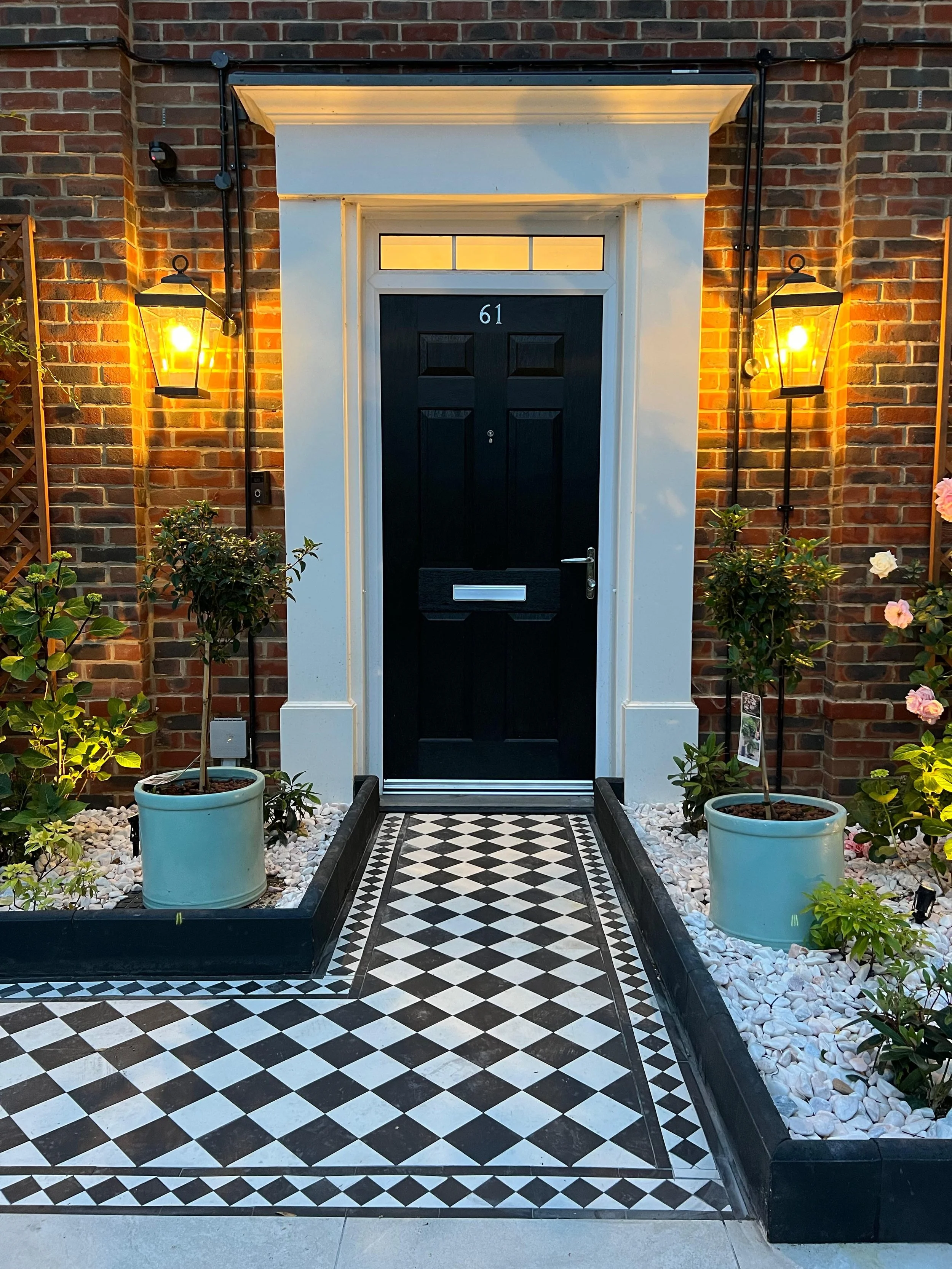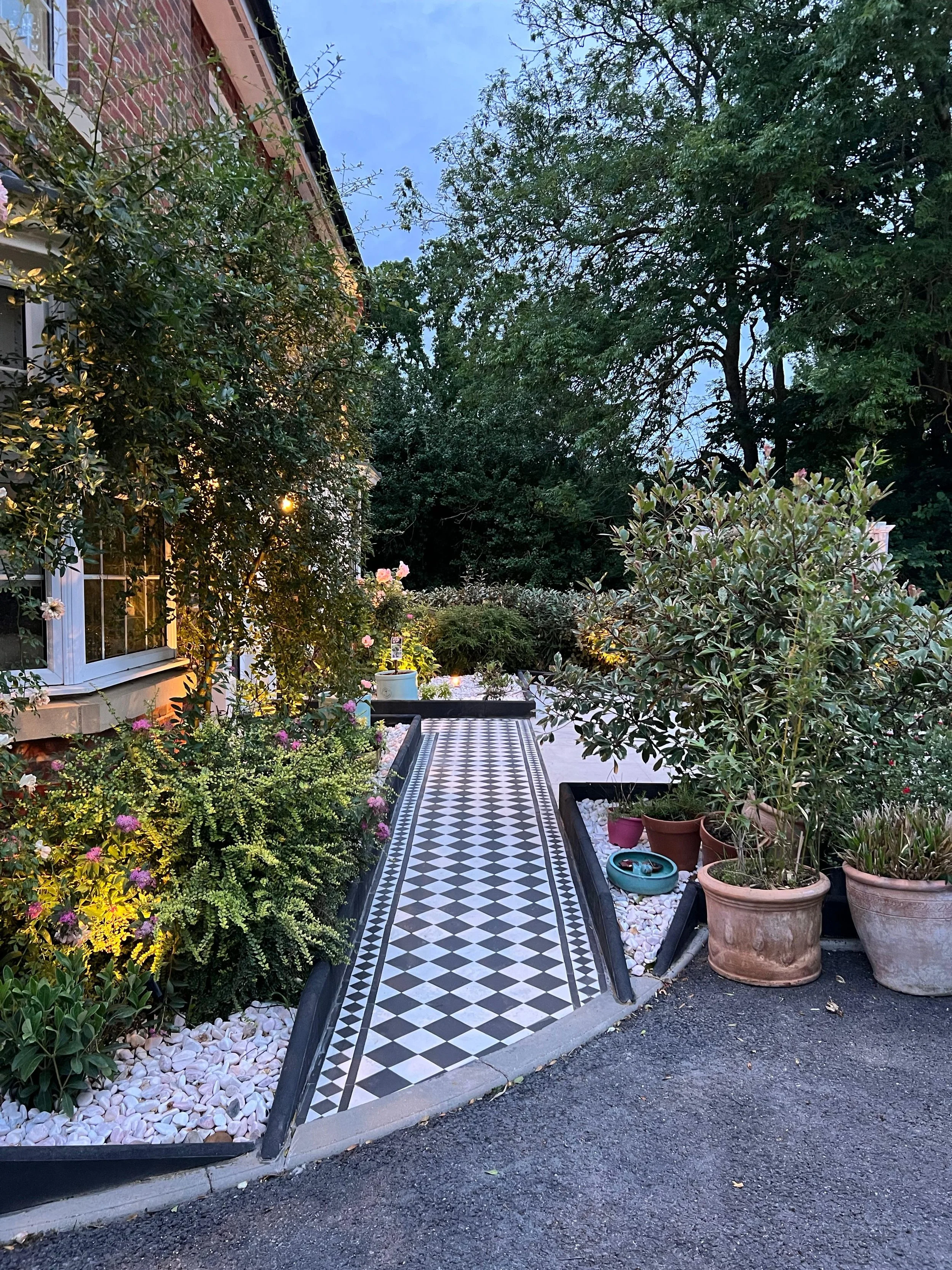Oxford Victorian tiled pathway, adding period charm with a bold black-and-white pattern.