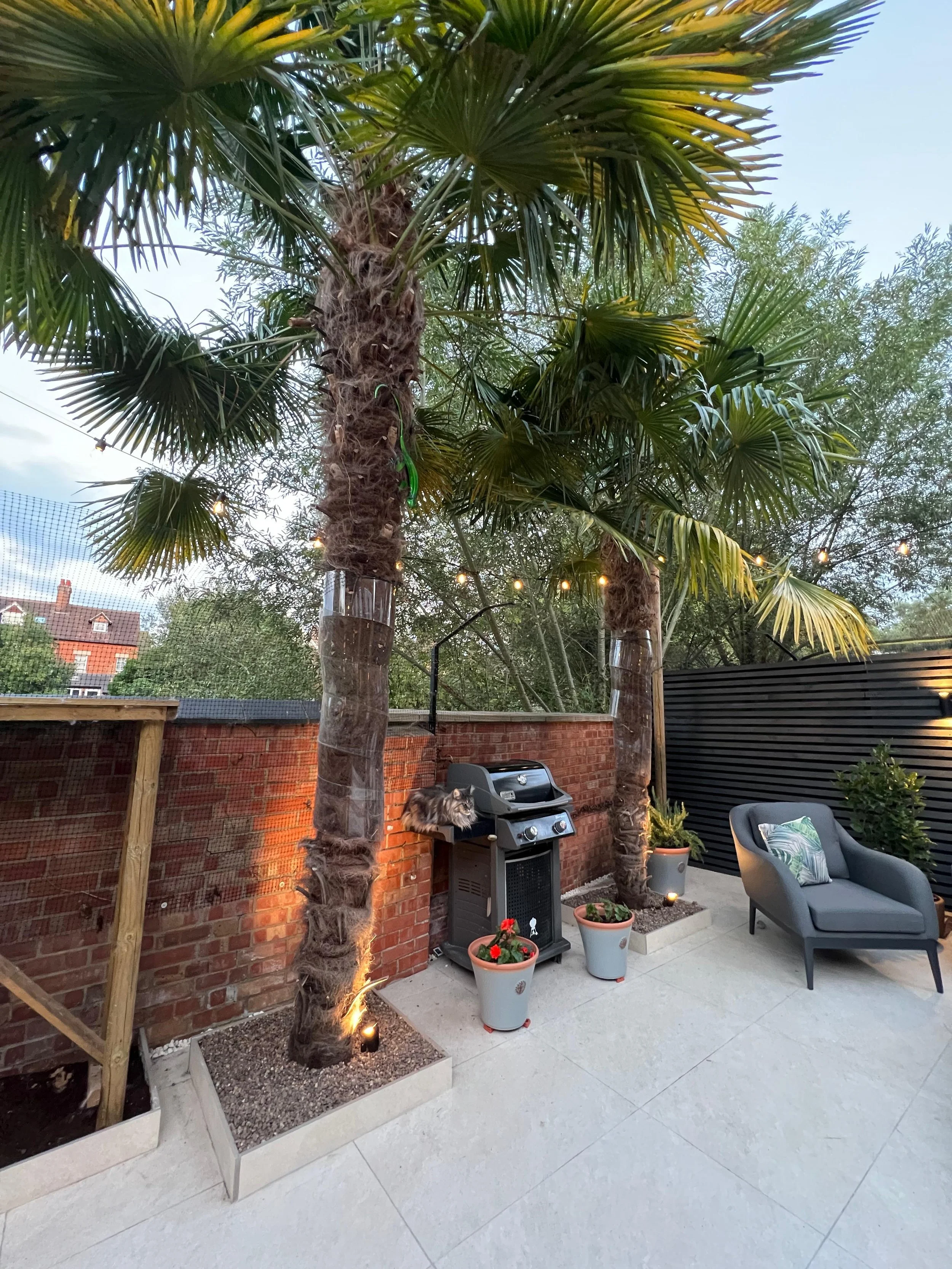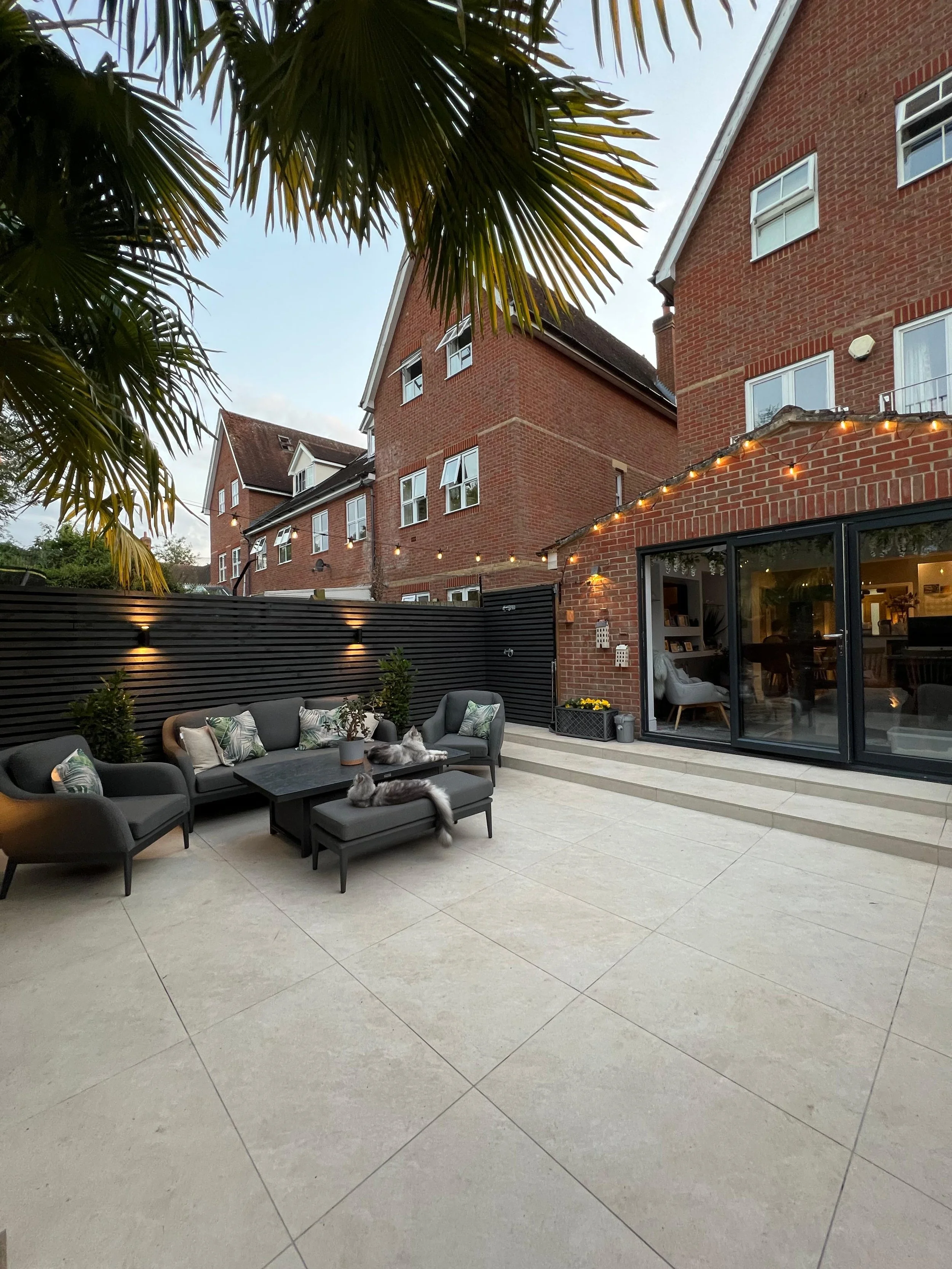 The result is a clean, elegant garden that feels like a natural extension of the home — stylish by day, atmospheric by night.