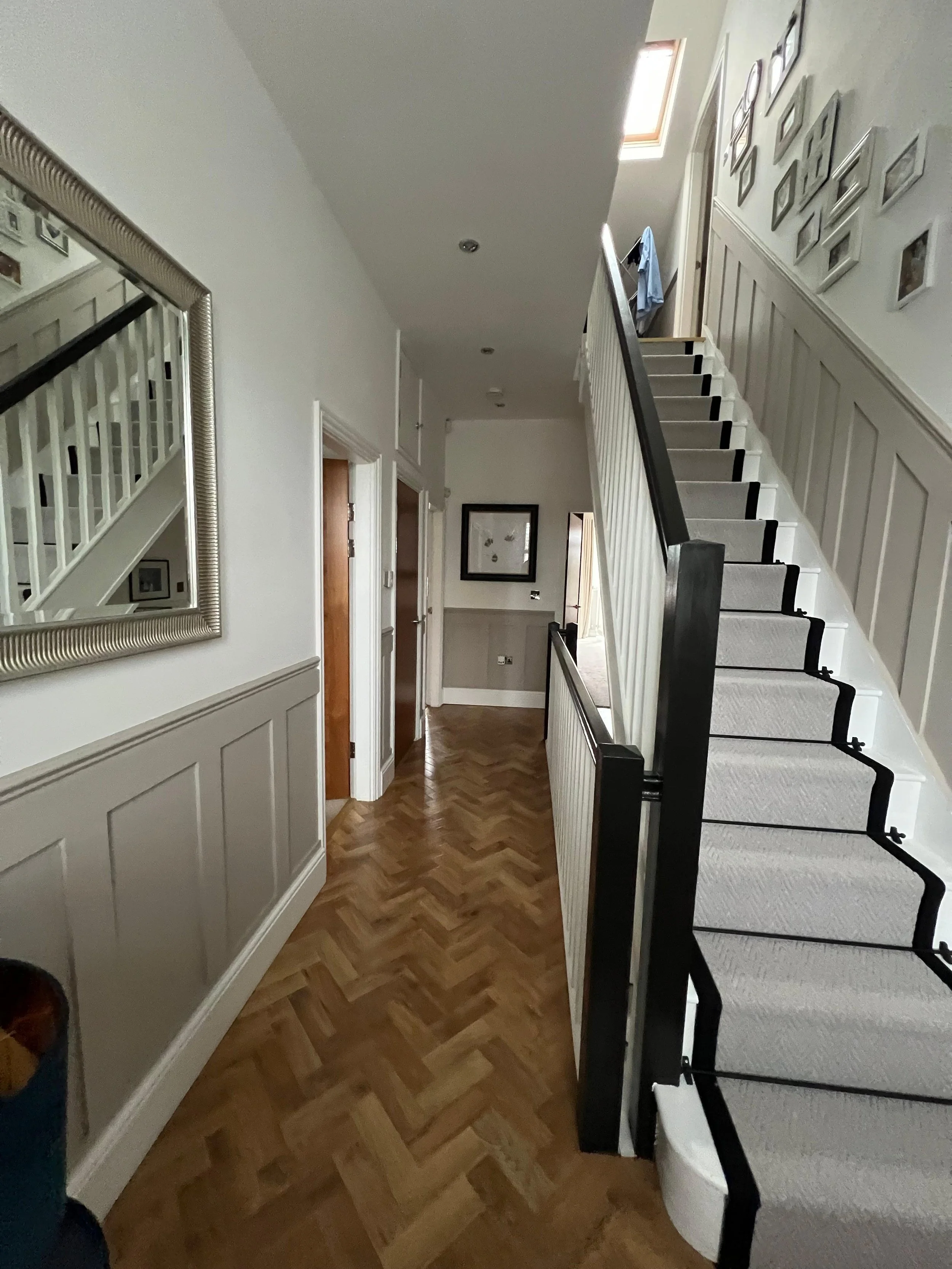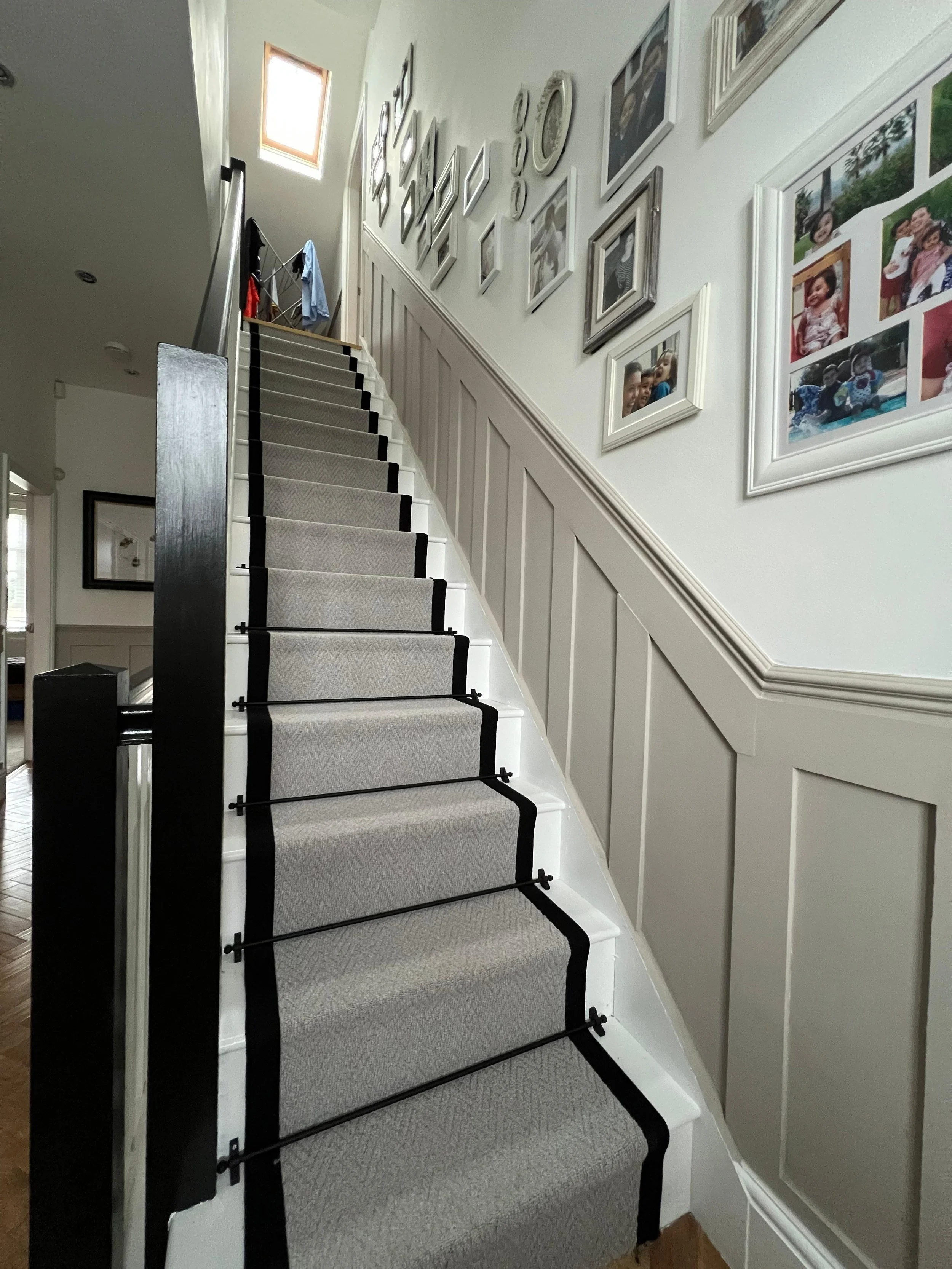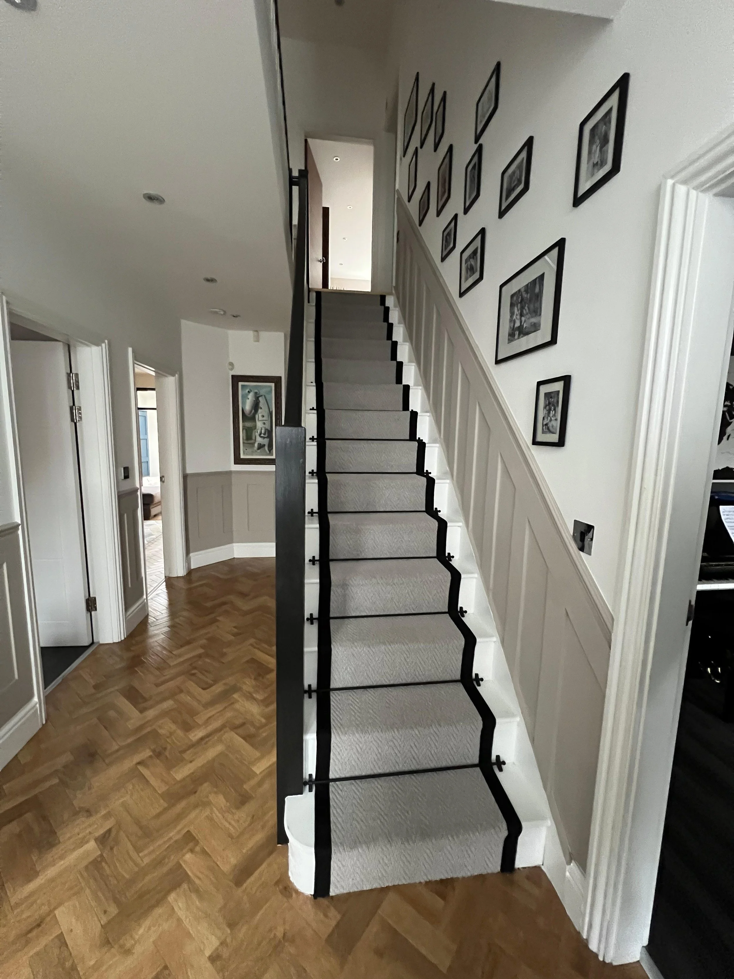 Staircase Runners – A striking runner with black trim and stair rods, giving the entrance and hallway a bold yet classic touch.