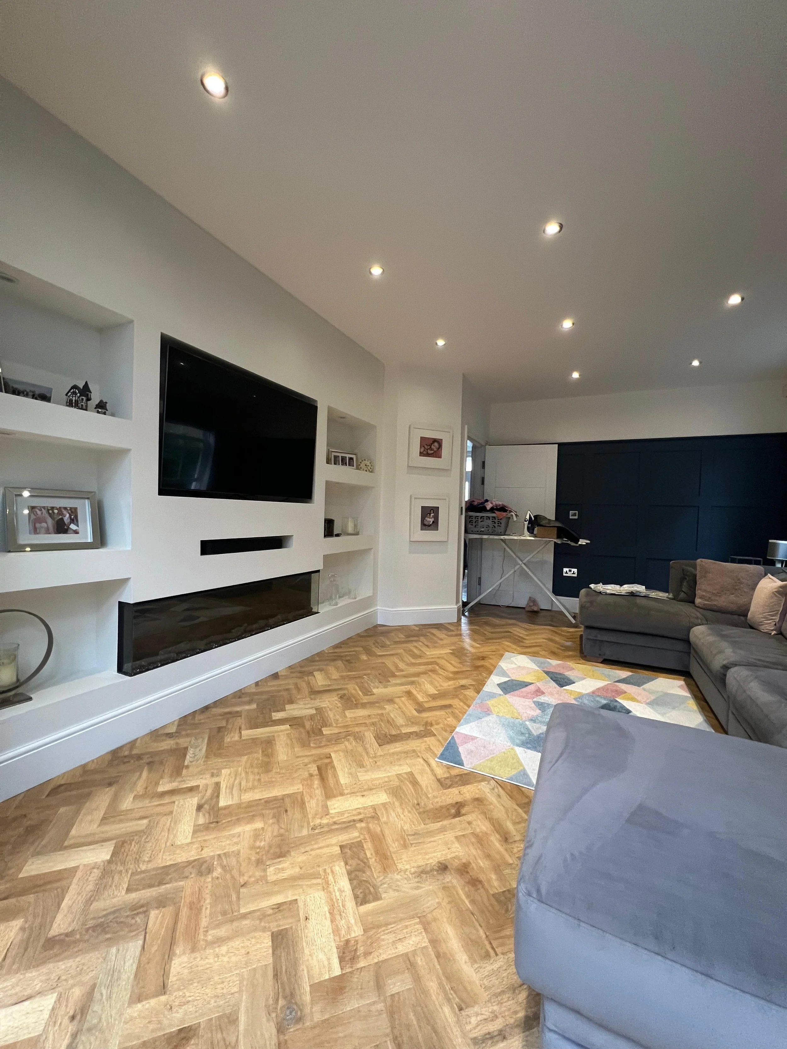 Bespoke Media Wall – Custom-built feature wall with integrated fireplace and storage, designed for both practicality and style.