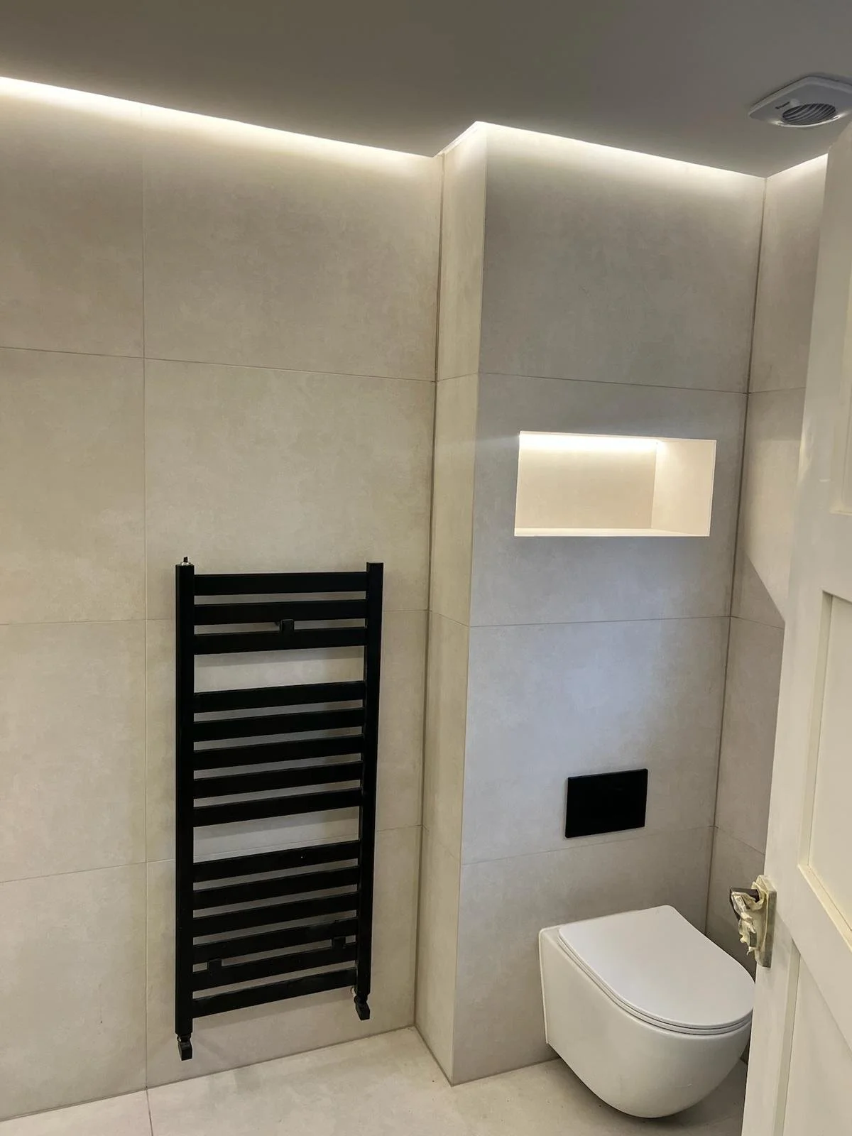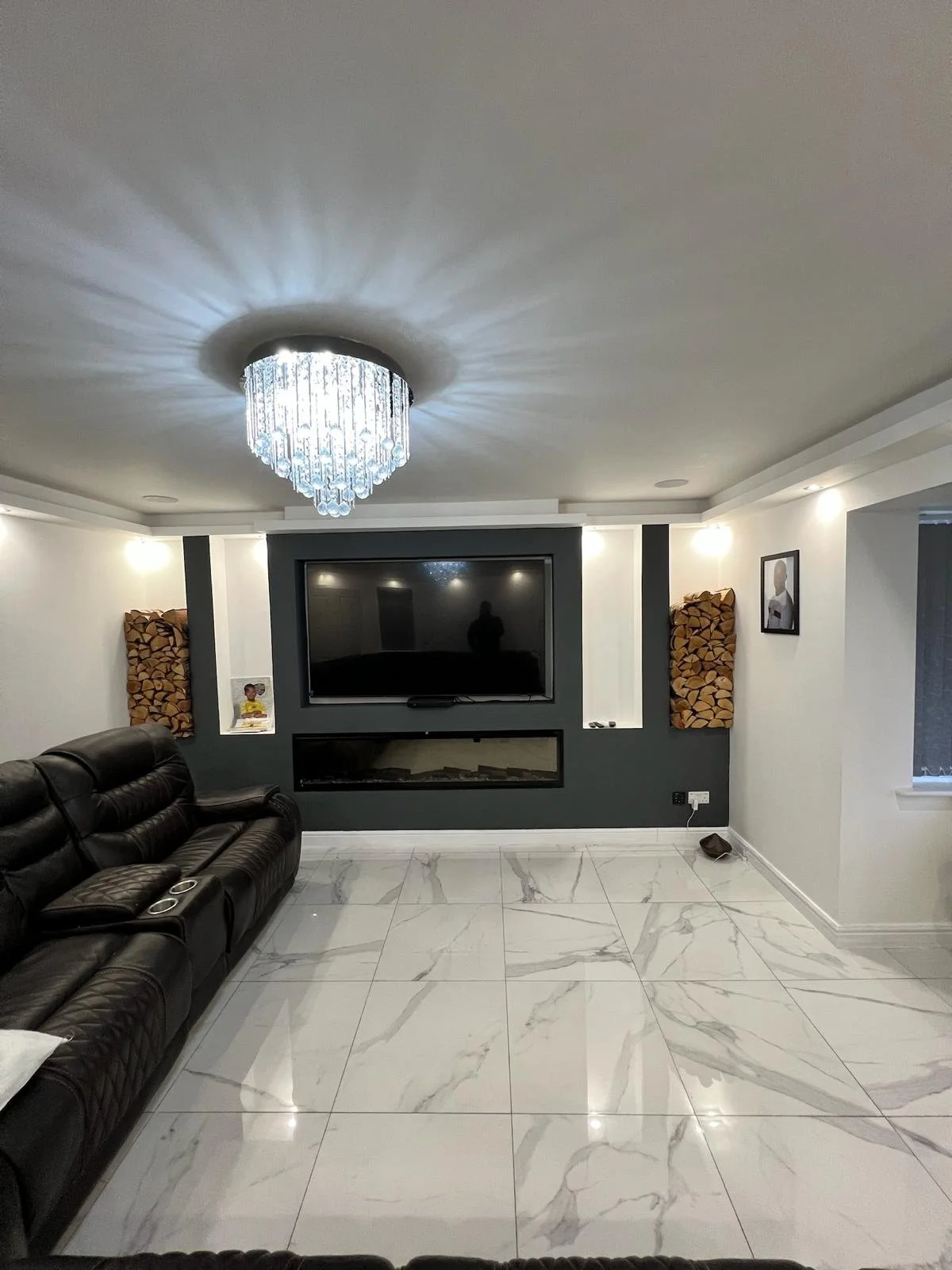 Living Room Upgrade – Installation of a bespoke media wall with built-in features, ambient LED lighting, and a statement chandelier for a luxurious feel.