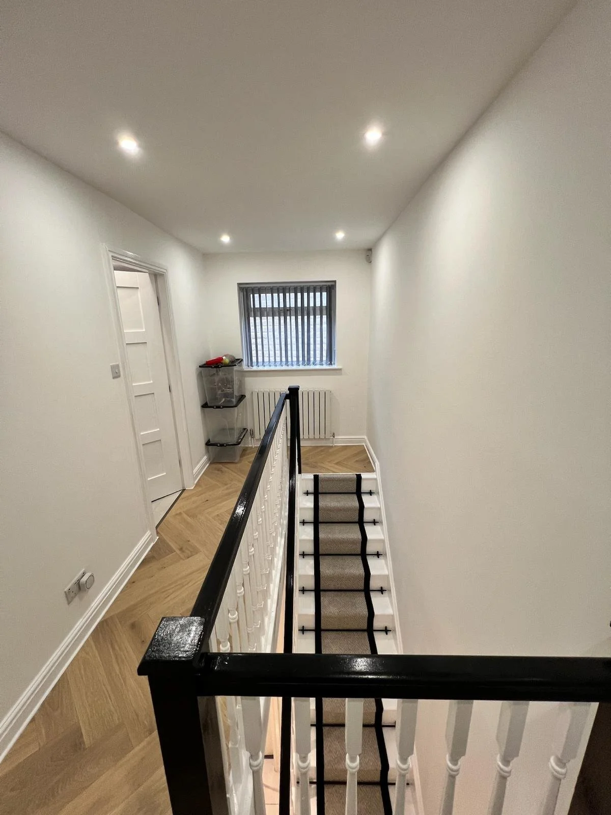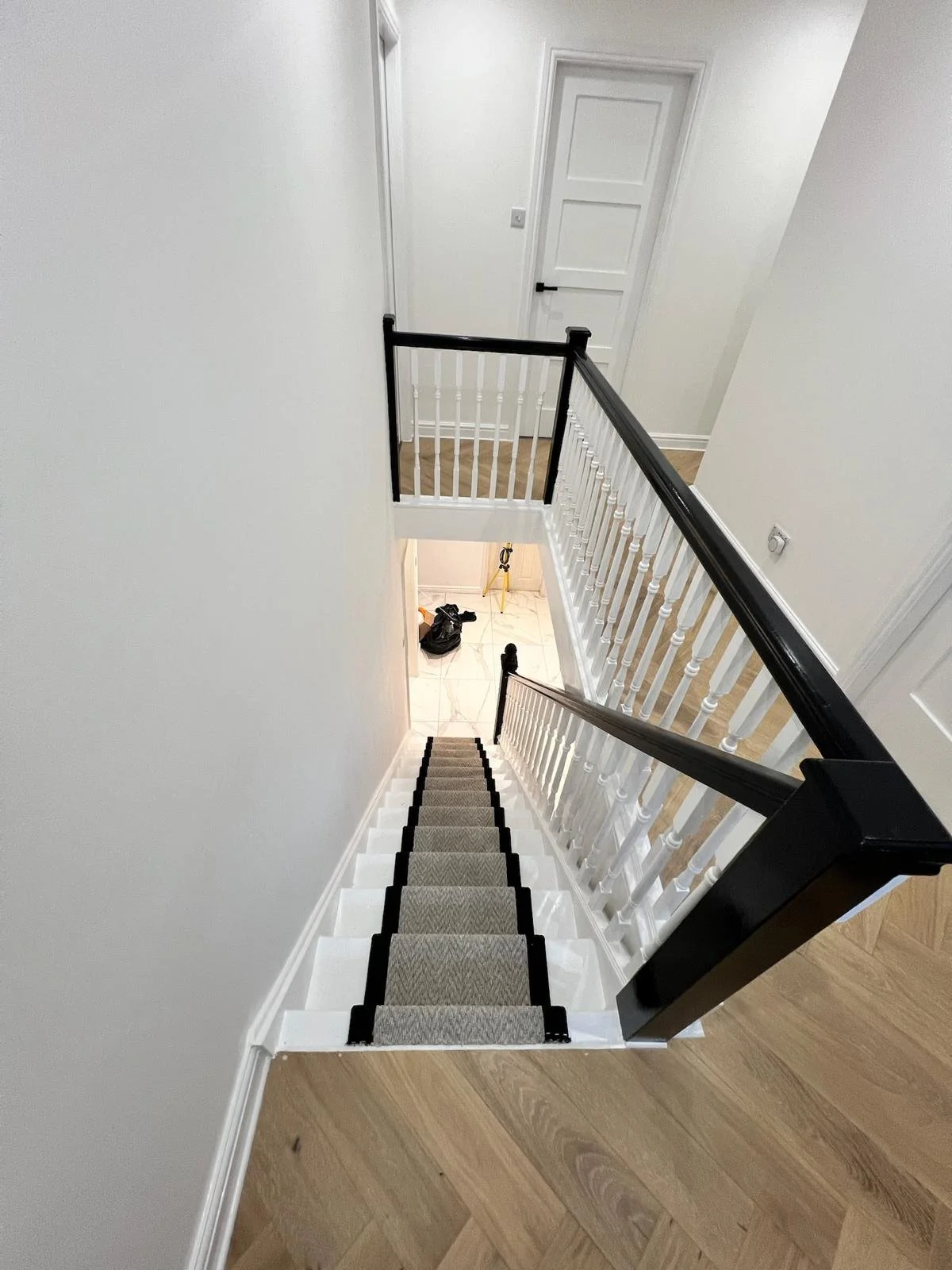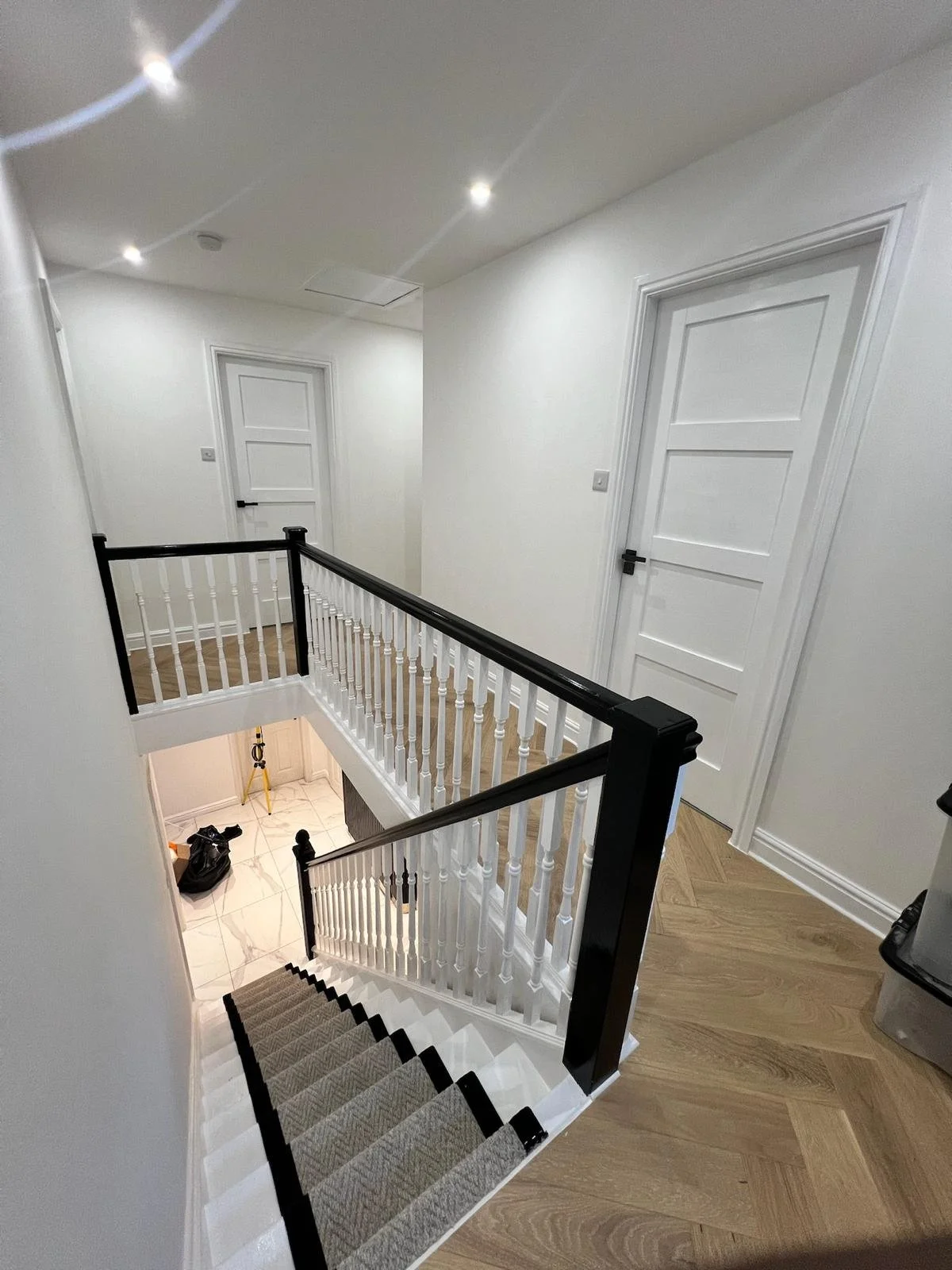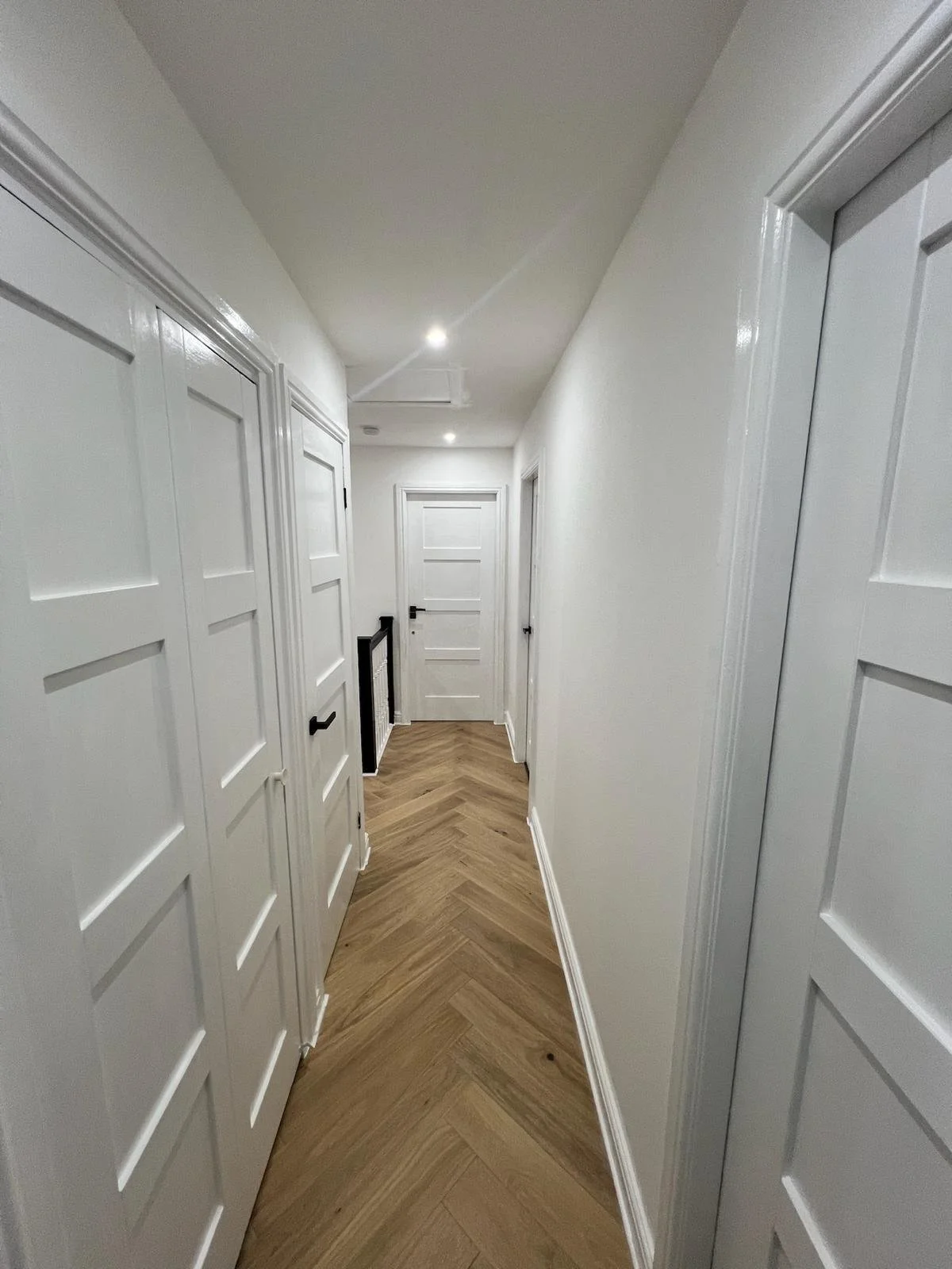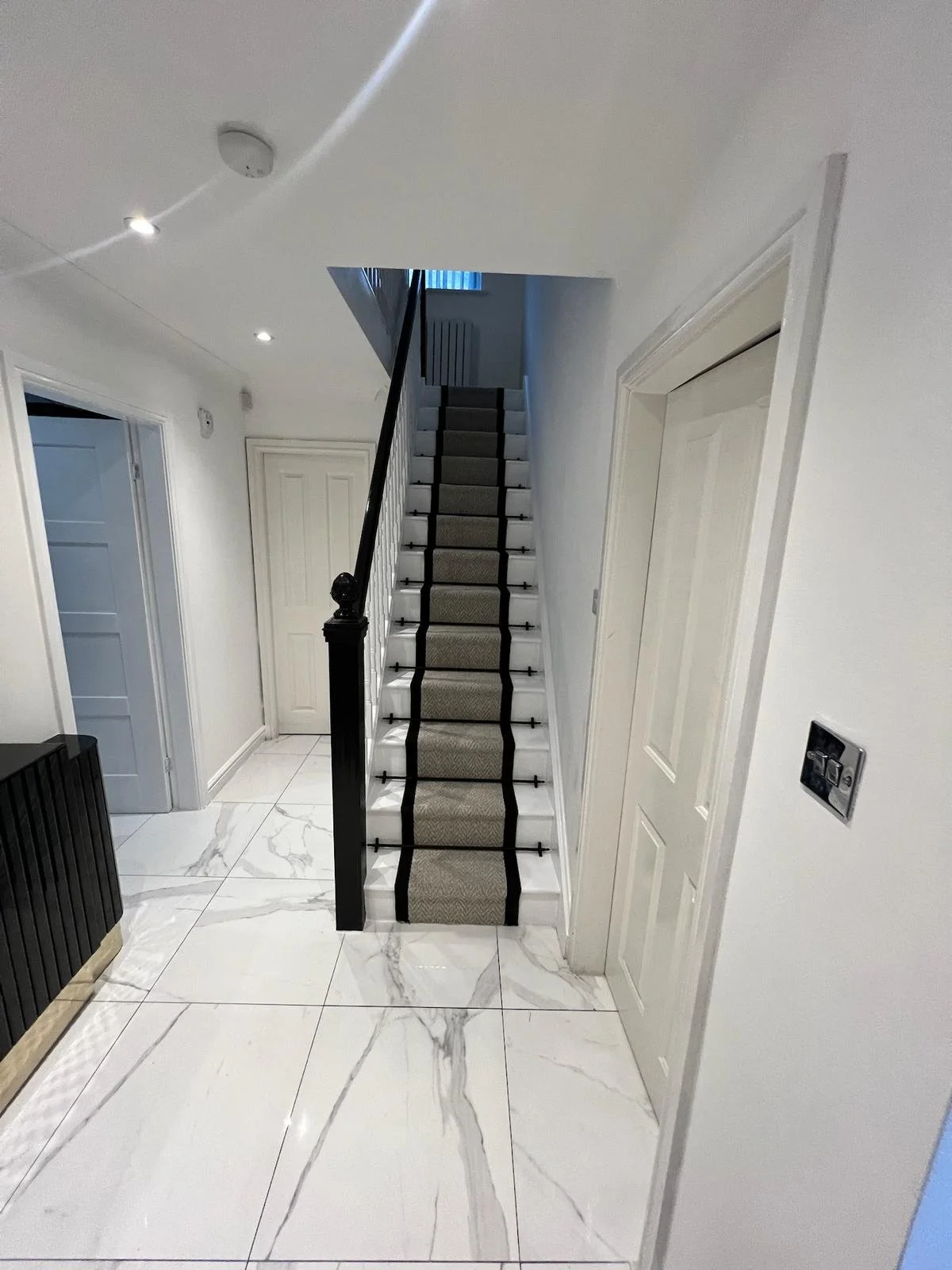Flooring & Staircase – Herringbone flooring throughout, tiled areas finished in marble-effect tiles, and a staircase runner for a refined touch.