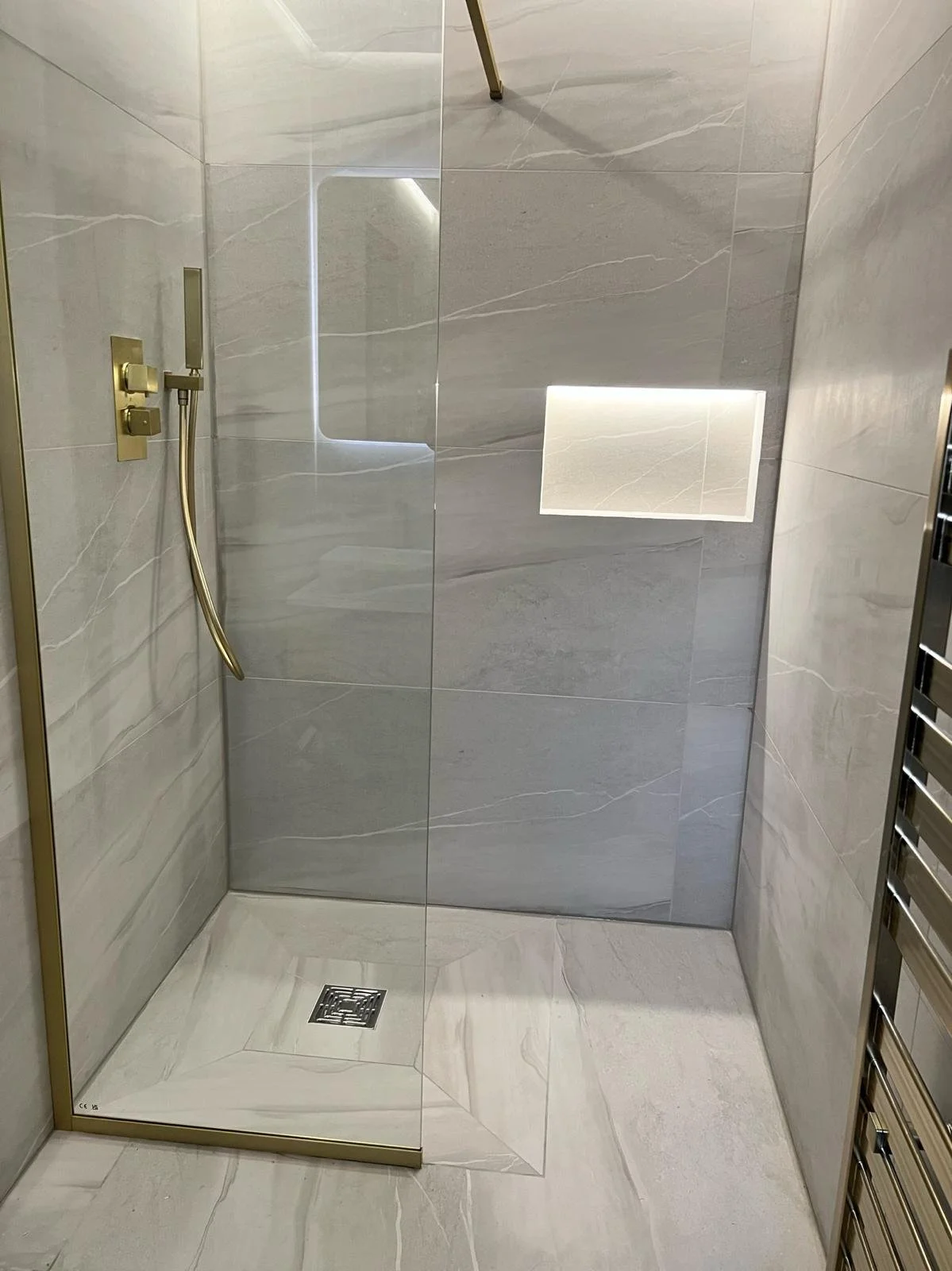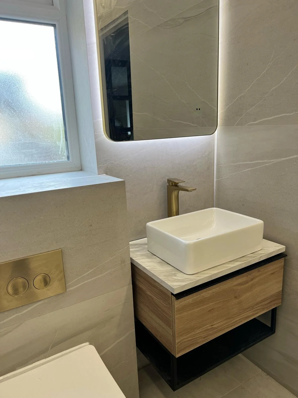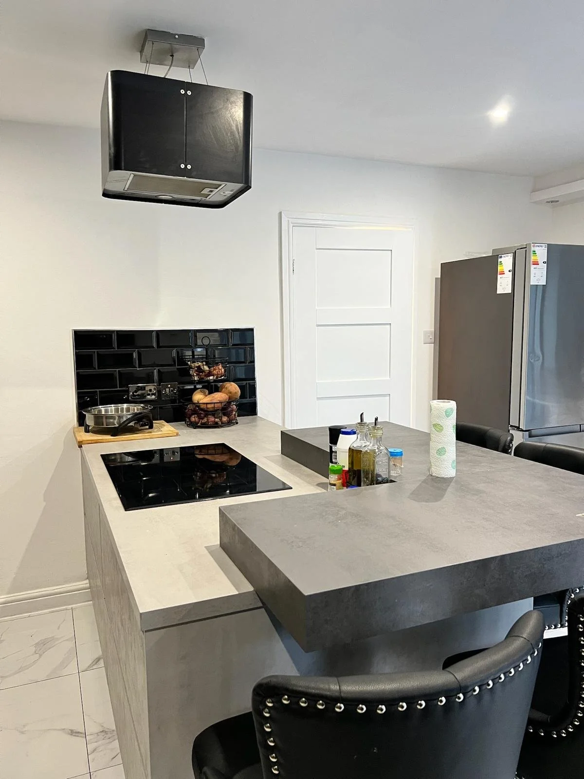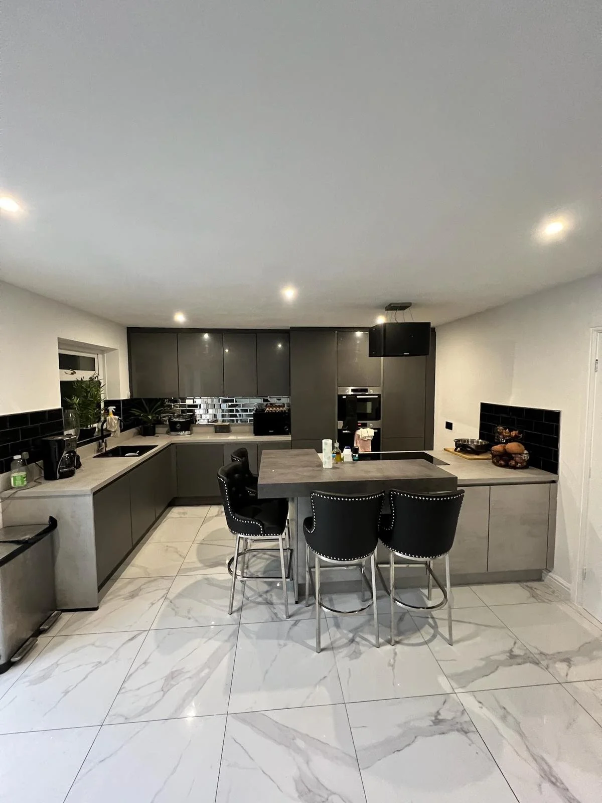 Kitchen Transformation – A sleek, modern kitchen with marble-effect tiling, an island with bar seating, and premium cabinetry, blending functionality with style.